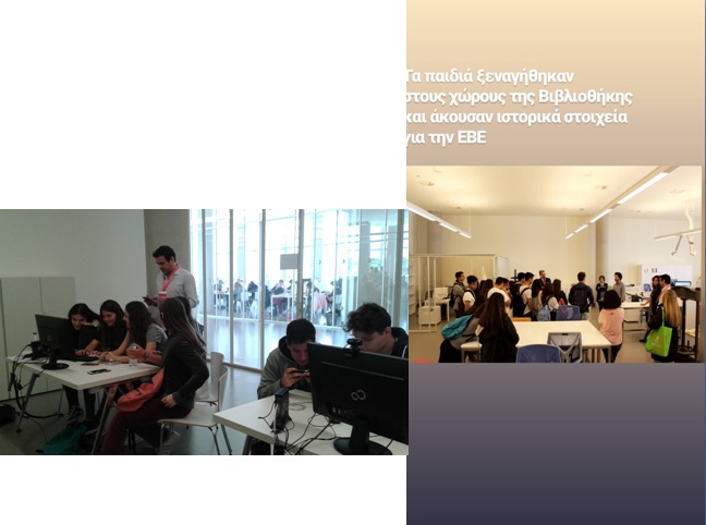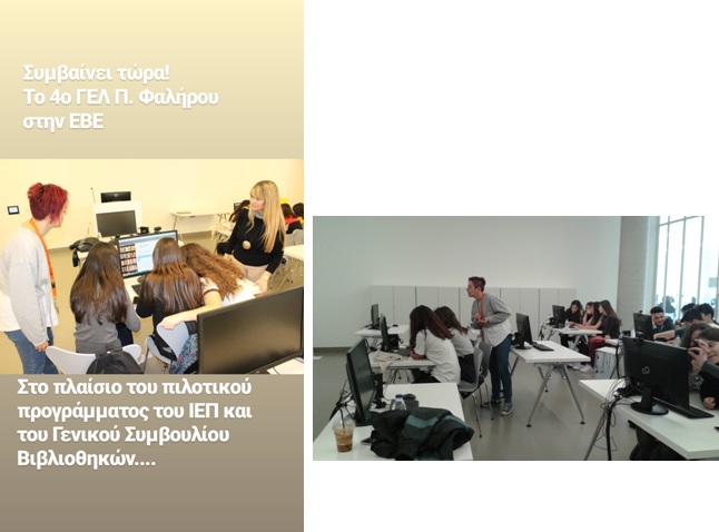Την Πέμπτη 19/4/2018 το τμήμα Α΄2 του Λυκείου μας επισκέφθηκε την Εθνική Βιβλιοθήκη της Ελλάδος στα πλαίσια της Πιλοτικής δράσης « Γενικά Λύκεια και Βιβλιοθήκες συνεργάζονται στην υλοποίηση των Δημιουργικών Εργασιών» που διοργανώνει το Ινστιτούτο Εκπαιδευτικής Πολιτικής (Ι.Ε.Π.) σε συνεργασία με το Γενικό Συμβούλιο Βιβλιοθηκών ( Γ.Σ.Β.) του Υπουργείου Παιδείας, Έρευνας και Θρησκευμάτων κατά το σχολικό έτος 2017-18.