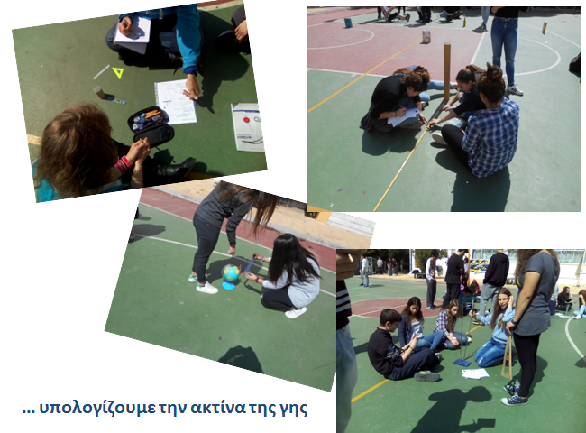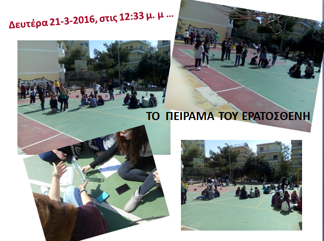 Το μεσημέρι της Δευτέρας 21-3-2016, στην αυλή του σχολείου μας, ομάδες από 45 περίπου μαθητές πραγματοποίησαν το πείραμα του Ερατοσθένη, σε μια κοινή δράση στην οποία συμμετείχαν περισσότερα από 370 σχολεία σ' όλη την Ελλάδα. Μαθητές από το Α4, το Β1 και από το πολιτιστικό πρόγραμμα "Δρόμοι της Επιστήμης...", μετρώντας το ύψος και τη σκιά διαφορετικών αντικειμένων υπολόγισαν τις διαστάσεις της γης. Συντονιστές της δράσης οι καθηγήτριες του σχολείου μας Βασιλική Μηλιώνη, Ελένη Σπυρίδωνος και Ευτυχία Καστανάρα.